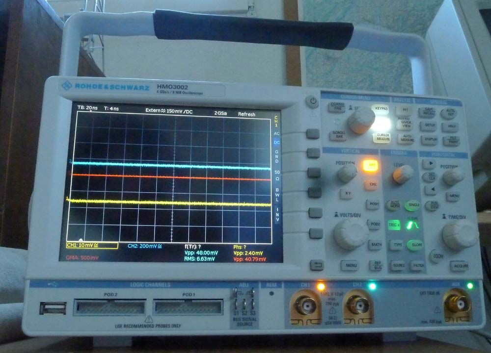 Dieses Gerät hat 2 Analogkanäle und 16 Logik-Kanäle, die gleichzeitig mit den Analogkanälen verwendet werden können. Die Bandbreite beträgt stolze 500MHz und die Samplingfrequenz 2GS/s bei 2 Kanälen und 4GS/s bei nur einem Analogkanal. In diesem Fall wird das Signal auf beide A/D-Wandler geschaltet und von den beiden Wandlern um 250ps zeitversetzt abgetastet und für die Darstellung die beiden Datenhaufen korrekt zusammengesetzt. Die Speichertiefe beträgt 4 Megasamples pro Kanal (oder 8MSamples, wenn nur ein Analogkanal genutzt wird). Die A/D-Wandler arbeiten mit 8 Bit und der Rauschpegel kann mit viel teureren Geräten mithalten.