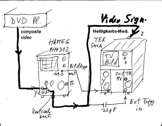 die meisten analogen Oszis haben einen Z-Eingang, mit dem die Helligkeit gesteuert werden kann. Die einen machen das digital, also Strahl ein oder aus, andere analog, also mit stufenloser Helligkeitssteuerung, wie z.B. mein Koreaner. So lässt sich auch ein Videosignal als Bild darstellen: