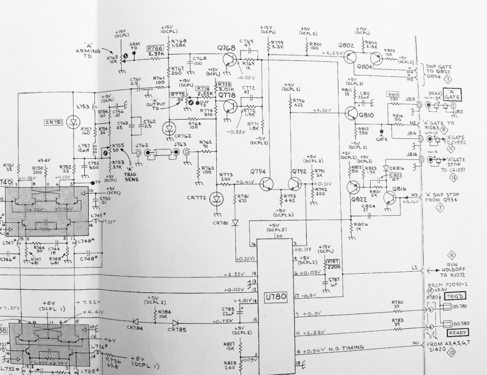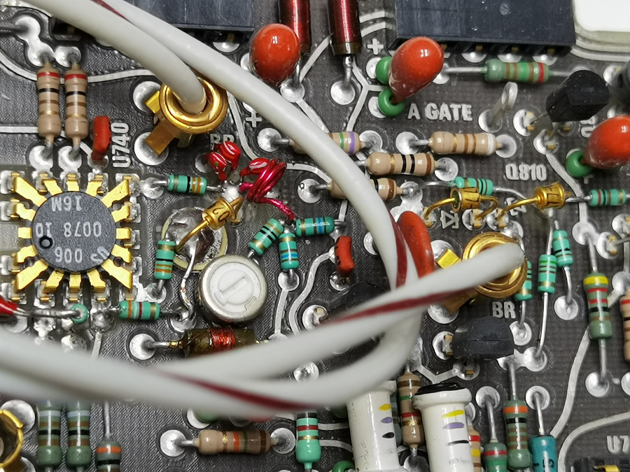 Ursache war eine schlechte Lötverbindung auf der Pille der ersten Tunneldiode. Warum ist da überhaupt so ein Teller? Nachlöten, dann war der Effekt beseitigt! Wie im Bild sichtbar ist der linke Anschluss auf so einem Teller aufgelötet. Der rechte Anschluß gesteckt. Die zweite TD ist beidseitig gesteckt, während die dritte TD rechter Anschluss auch wieder gelötet ist. Wie die Schaltung da mit 3 TD überhaupt exakt funktioniert hab ich nicht verstanden. Beteiligt ist auch das Tektronix eigene Sweep Control IC U780. Eine Innenschaltung ist aber nicht gezeigt. auch nicht im Manual. Das ist TEK Know-how
