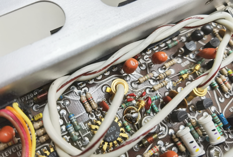 Es sind auch viele orangene Tantalperlen verbaut, aber ich hatte keine Ausfälle. Ich würde die erstmal nicht wechseln, nur wenn welche ausfallen. Problematisch sind die BNC-Buchsen. Diese sind isolierte wegen der 1x, 10x, 100x Umschaltung. Braucht man Ersatz, weil vorne die Hülse ausgebrochen ist, muss man suchen! Der Einbauort ist eng!