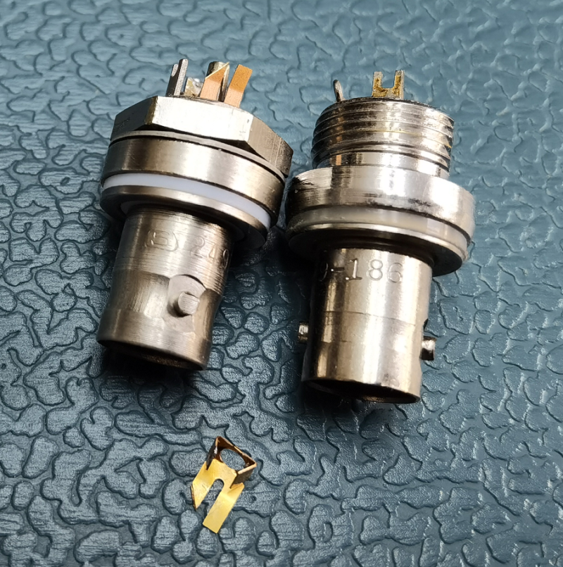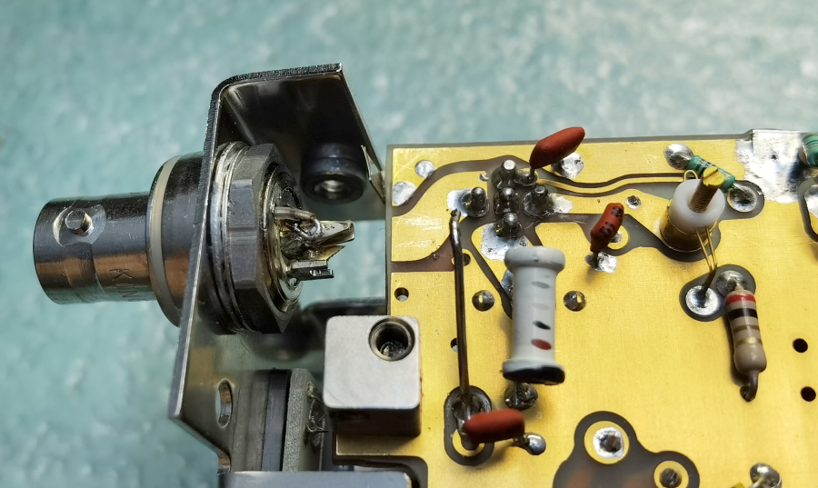 Ich fand in einem Online Shop auf Griechenland noch originale Buchsen- Puhh! Man kann sich auch helfen, indem man vor die BNC-Buchsen sich selber eine Stück Rohrhülse dreht und wie so eine extradicke U-Scheibe die Gewindelänge reduziert. An dem Mittelanschluss der BNC-Buchse, ist so ein goldenes Federblech angelötet. Diese ist aber nicht mit der Leiterplatte verlötet.