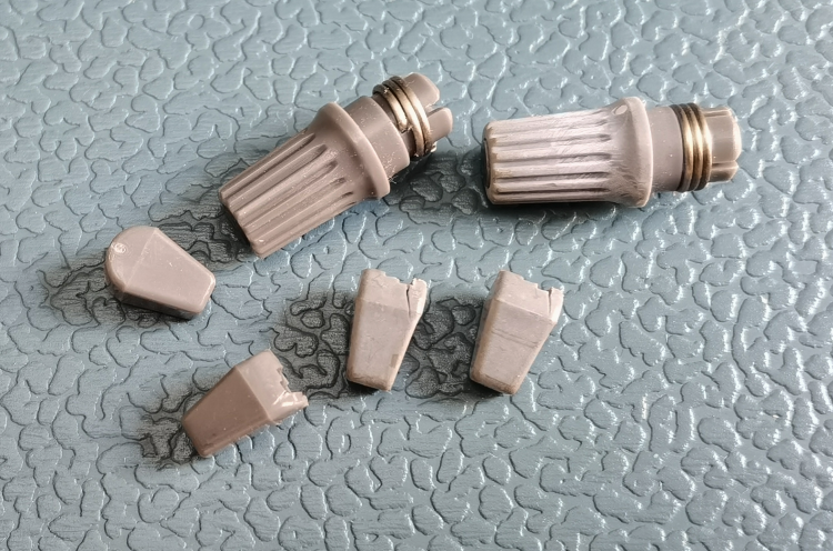 Zum Schluss: Ein Tek-Ärgernis sind diese kleinen grauen Knöpfe auf den Schalterchen, die sich in bis zu 52 Jahren (wenn man mit dem 453A von 1968 anfängt) von dunkelgrau glänzend nach hellgrau matt ändern und auch aufreissen durch die eingelegte Feder und deren Spannung!