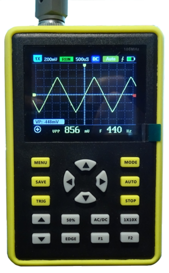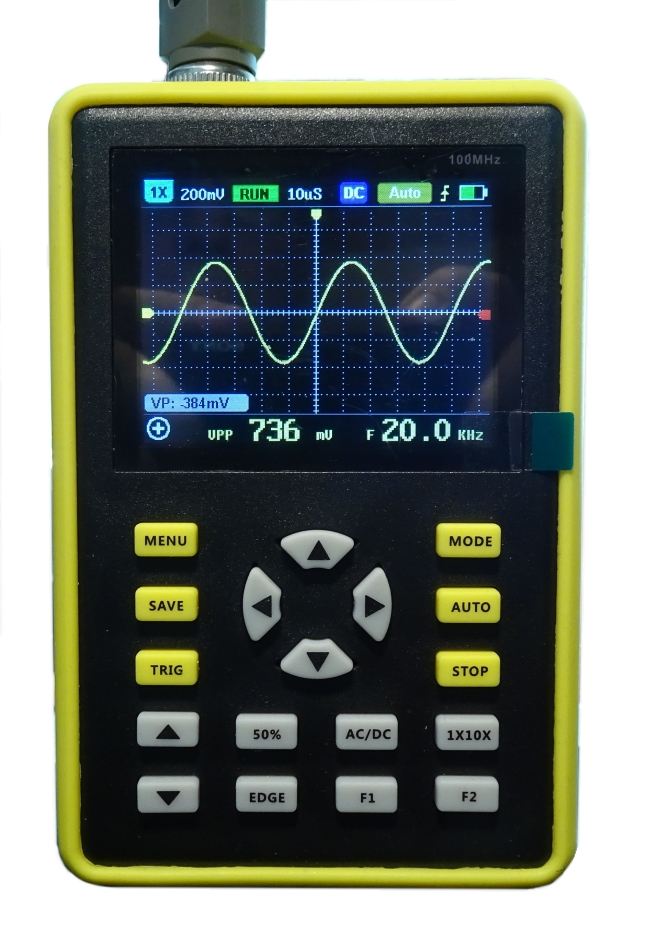 konnte nicht widerstehen und kaufte mir so ein Winzig-Oszilloskop, welches unter diversen Namen angeboten wird. Es soll bis 100 MHz (mit Abschwächer) anzeigen können. Akku ist eingebaut, via USB ladbar, allerdings muss das Steckteil des Kabels für das Gerät länger als normal sein.
