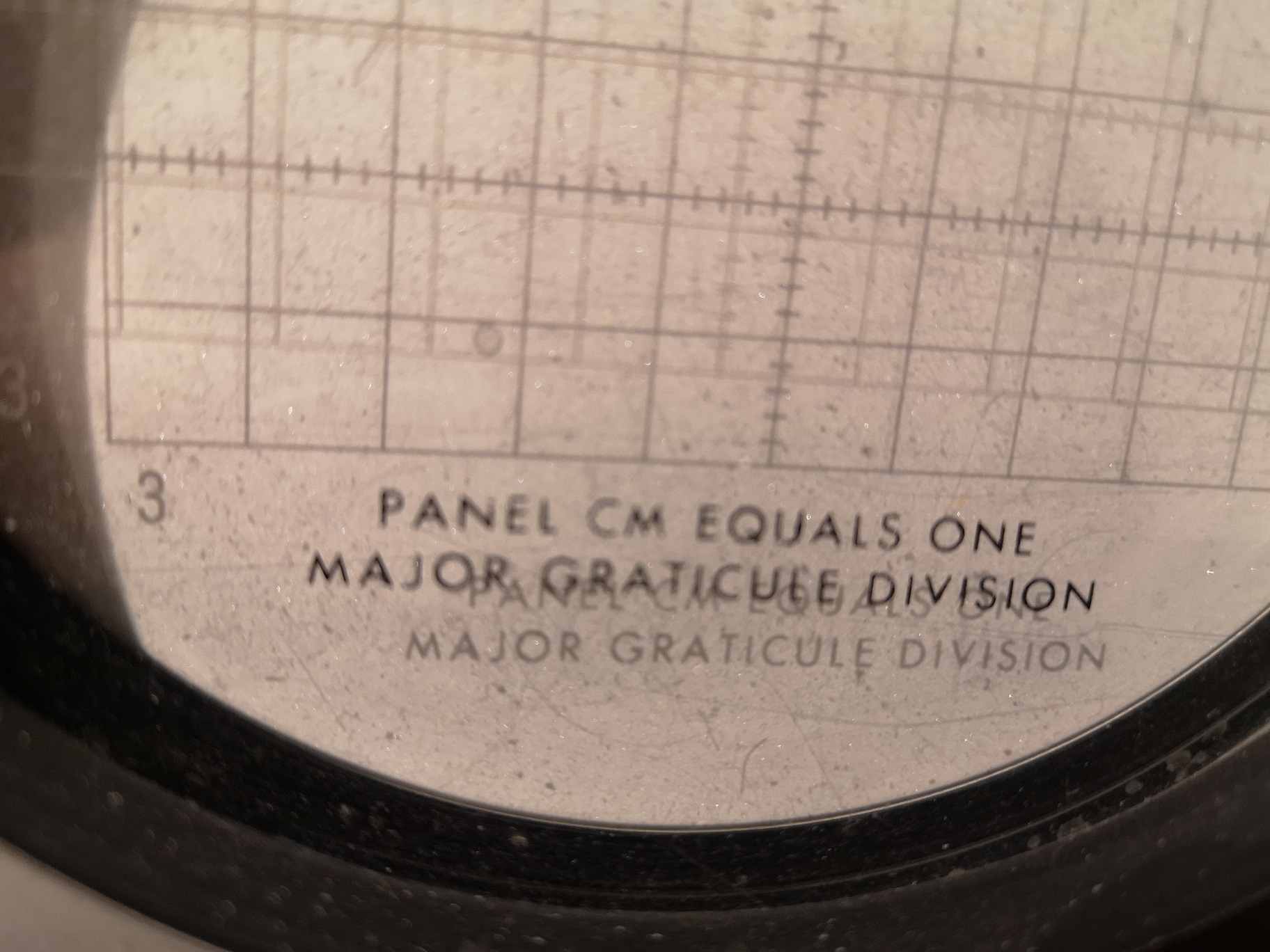 es gibt wie immer auch eine Ausnahme, die ist allerdings extrem selten. Wenn ein alter Tek, der üblicherweise V/cm anzeigt, durch eine Werksoption eine höhere Beschleunigungsspannung bekommen hat dann hat man ihm extra deswegen eine Plexischeibe eingebaut deren Einteilung kleiner ist als 1cm und einen Hinweis darauf gibt daß ein Kästchen auf dem Bildschirm einem cm der Einstellungen an der Frontplatte entspricht, das seht ihr hier