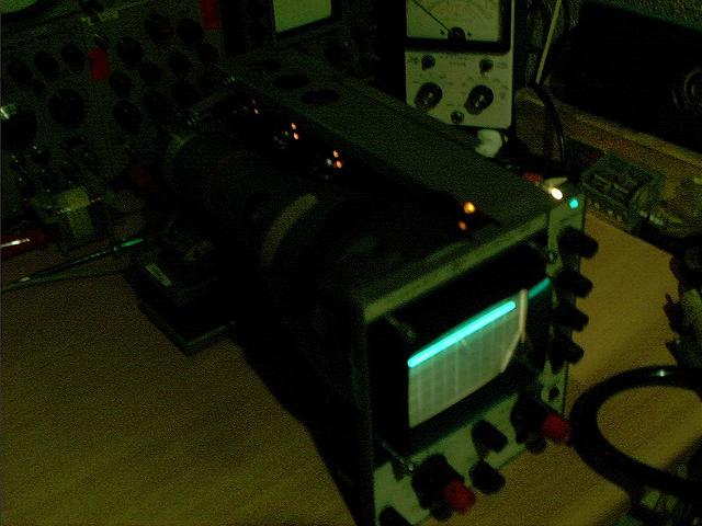 es war nur ein defekter Kondensator, der Telequipment lebt. Er versucht schon vorsichtig zu glänzen ... dauert aber noch etwas. Das Gerätchen ist ausgesprochen warm. "Trace Rotation" funktioniert bei Teleqipment etwa so: Schelle losmachen, Bildröhre drehen, Schelle wieder festmachen...