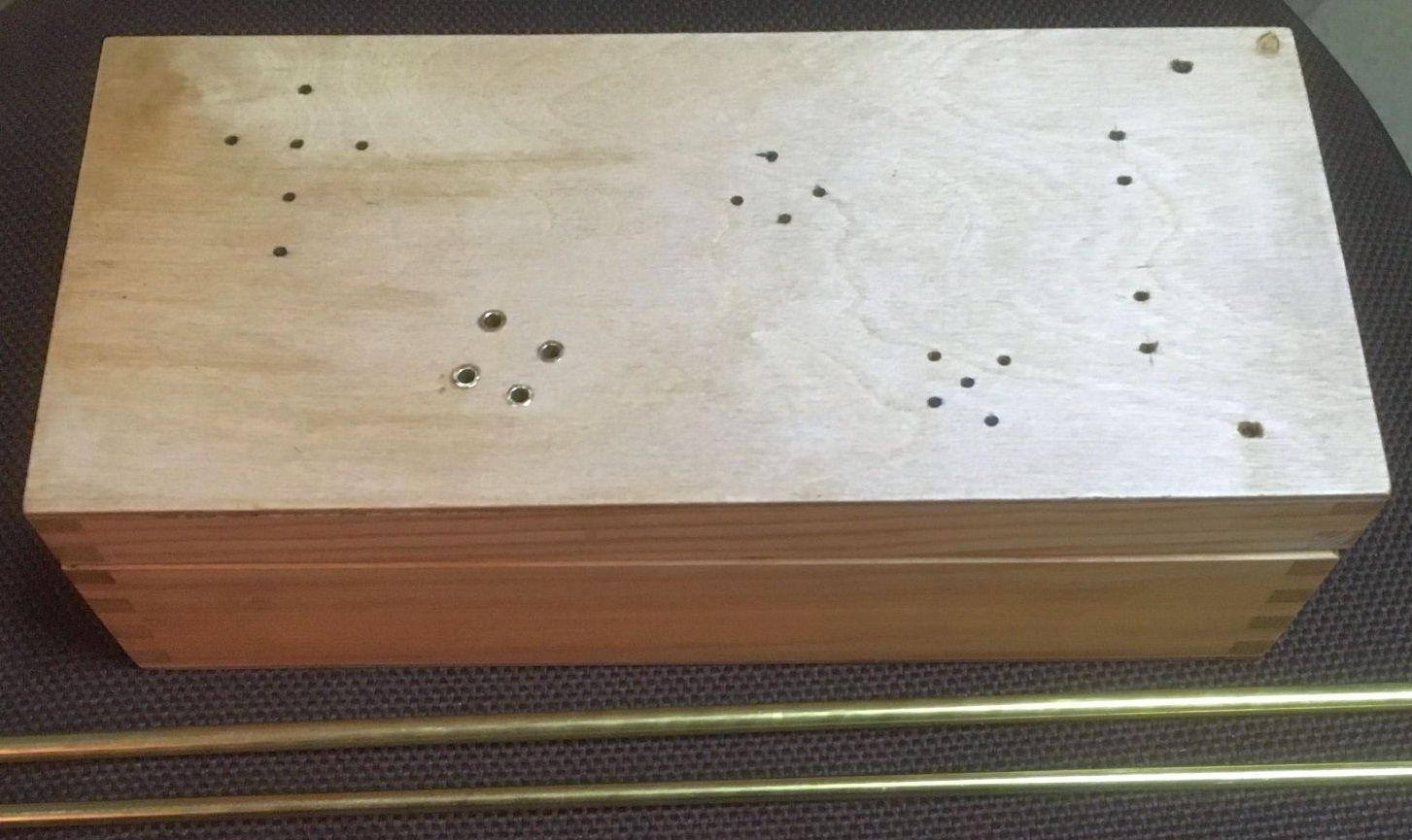 Bis auf eine Messing-Gewindestange (ähnlich M3, aber Zoll), die die beiden Deckel zusammenhalten, gibt es nichts, was die Induktivität beeinflussen könnte. Ohne Gewindestange messe ich 251,9 µH. Ob der gerillte Wickelkörper aus Pertinax oder Trolitul besteht, kann ich nicht sagen. Nachtrag: kurze Bekanntschaft mit dem Lötkolben lässt eher Trolitul vermuten.