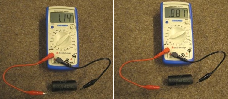 Man sieht also deutlich den Unterschied. Dieser Alt-Kondensator ist kein Einzelfall. Auch kleinere Alt-Kondensatoren sträuben sich ähnlich gegen eine sichere Kapazitätsmessung. Wäre nur allein die Kapazität bei den Altkondensatoren durch Alterung verändert, müsste die doch genauso sicher und gleich wie bei Neu-Kondensatoren ausgemessen werden können.