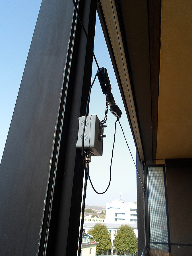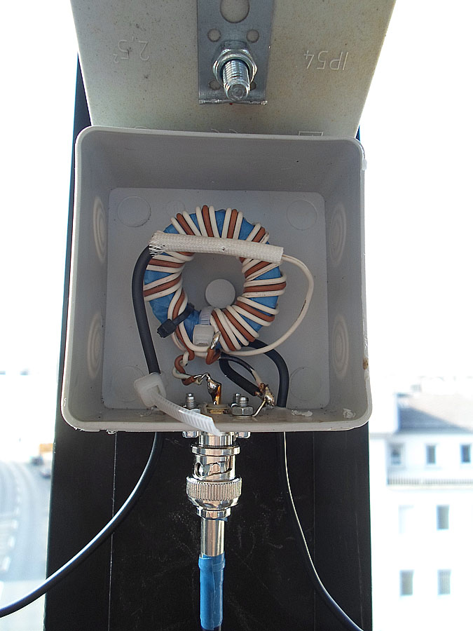 Urlaub ist vorbei und jetzt kann man wieder was machen. Nach längere Überlegung, bin ich auf die Idee gekommen, eine modifizierte T2FD auf meinem Balkon aufzubauen. Gesagt - gemacht. Wie die Antenne aussieht, das auf die Bilder und Skizze.