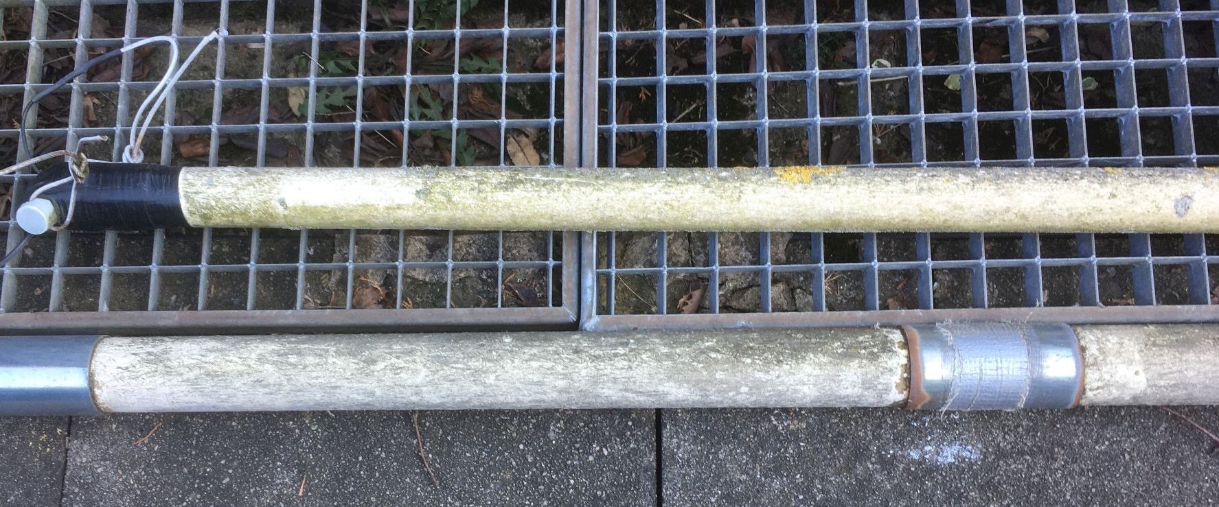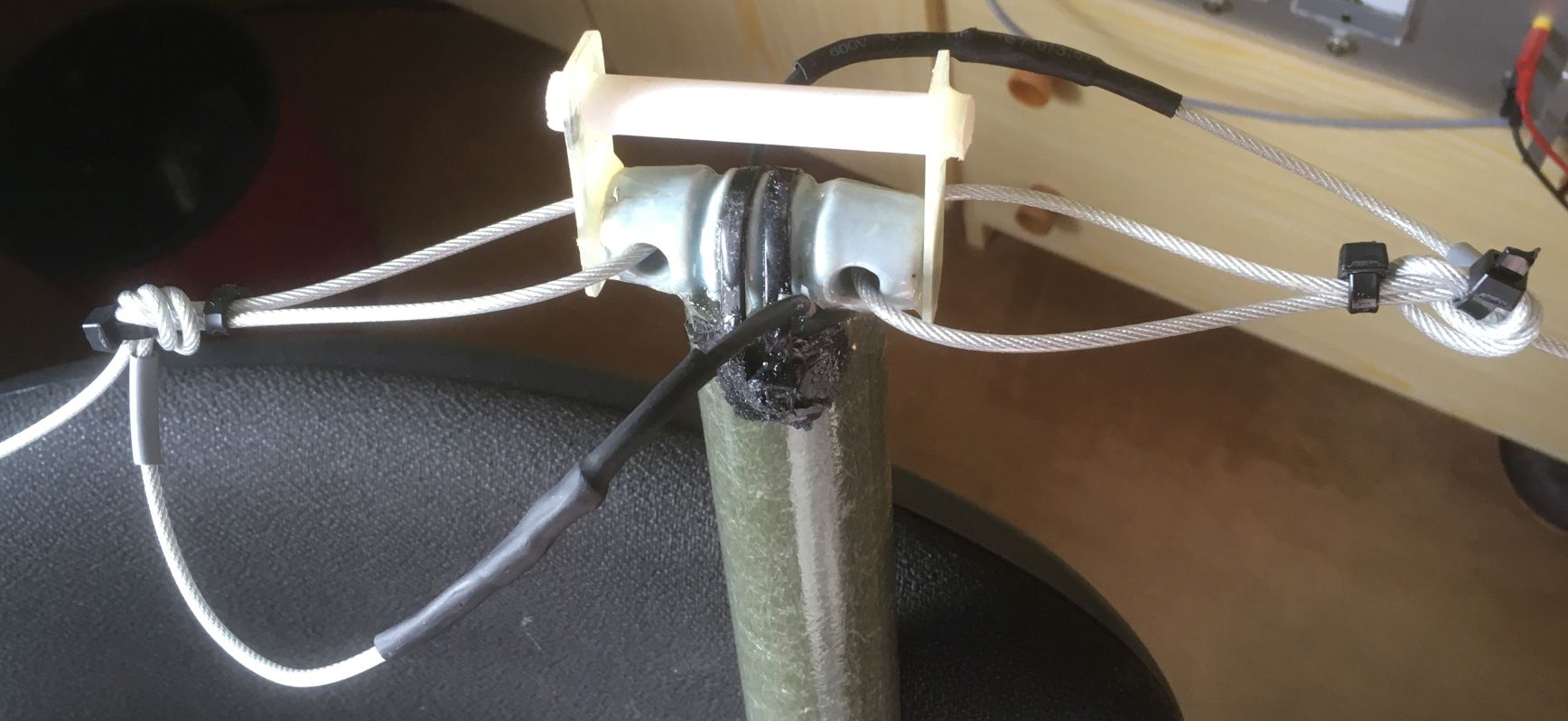 über die Bühne, die wegen Corona 2 Jahre später als geplant stattfand. Ich brauchte eine helfende Hand und wollte das nicht mit meiner Frau durchziehen. Nach mehr als 20 Jahren ist der Fiberglassmast rissig und wasserdurchlässig geworden. Das Wasser fand dann seinen Weg innerhalb des Rohres in den Dachboden, das am Fusspunkt mit Altbeständen "Pampers" aufgefangen werden musste. Ein simples Abdichten des Rohres war aus elektrischen Gründen nicht ratsam, weil dort eine 450 Ohm - Zweidraht - Bandleitung geführt wurde.
