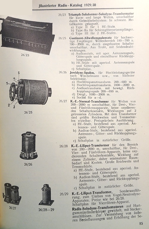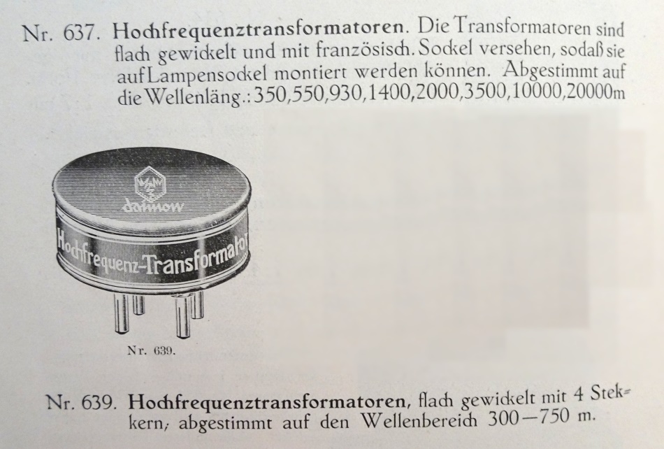 beim Suchen nach einem bestimmten historischen Radio-Bauteil stieß ich in einem Katalog von 1924 auf zwei angebotene HF-Transformtoren: