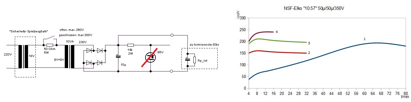 Das ist durchaus nachvollziehbar: Bei 300 Volt und 6 mA würden im Elko schon satte 1,8 Watt verbraten, womöglich beschränkt auf einen kleinen Bereich einer Fehlerstelle. Im Netz sind Lösungen mit Netzspannung und Glühlampe zu finden, ich ziehe die Verwendung eines kleinen Netzteiles mit Potentialtrennung vor.