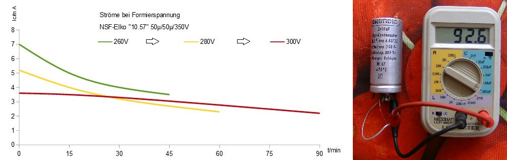 Heute, (am dritten Tag) wurde ein leistungsstärkers Netzteil verwendet und jetzt "Butter bei die Fische": Formierung mit 260V , 280V und abschließend 300 V. Dabei wurden die Ströme gemessen, um bei Merkwürdigkeiten abzubrechen: Überraschender Weise ergab sich aber immer eine Verbesserung in den Werten.