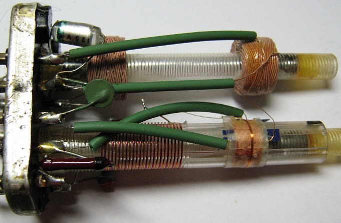 Neben den zwei Germaniumdioden ist ein Trimmpoti und die Spule zu entdecken. Ich nehme an, es stammt aus einem Fernseher mit 5,5 MHz-Ton-ZF, weil bei Radios im selben Abschirmbecher meistens noch ein Bandfilter für die AM-ZF vorhanden wäre. Auf dem Becher ist noch ein Aufkleber mit dem Schriftzug "Filter 9". Neun Filter kommen mir für ein Radio recht viel vor. Oder liege ich bei meinen Vermutungen da falsch?