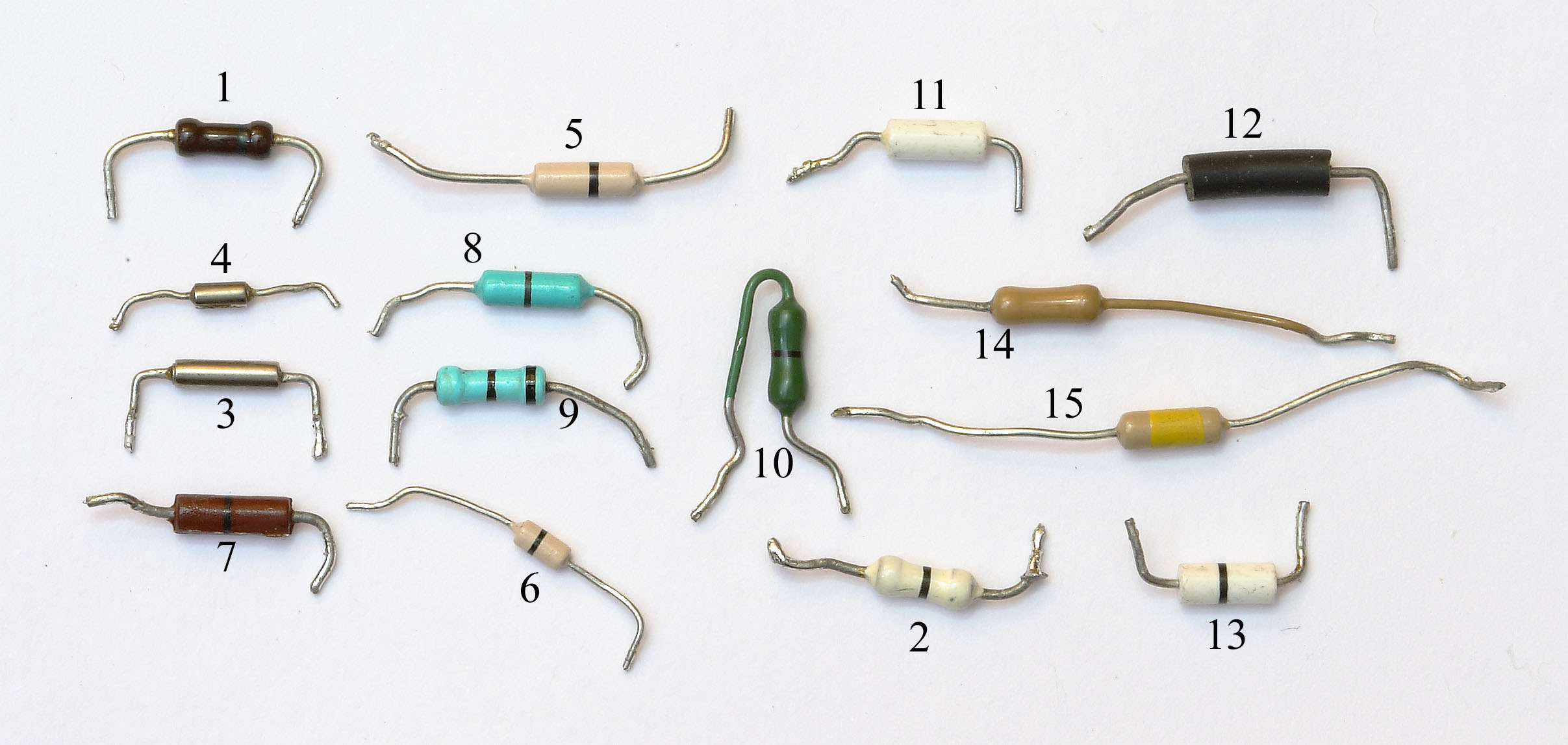 1. 0,5W-Typ für allgemeine Anwendungen 2. 0,5W-Typ für „weiße Ware“ 3. 1W Metallschichtwiderstand mit hoher Langzeitkonstanz 4. 0,5W Metallschichtwiderstand mit hoher Langzeitkonstanz 5. 0,25W-Typ für allgemeine Anwendungen 6. 0,1W-Typ für allgemeine Anwendungen 7. 0,5W-Typ 2% Toleranz 8. 0,5W-Typ 1% Toleranz 9. 0,5W-Typ 0% Toleranz (absolut genau – 0,0 Ohm) 10. 0,5W 1% stehende Militärversion 11. Low-coast-Typ für Ströme bis 6,3A, 10% Toleranz 12. Low-coast-Typ für Ströme bis 1.4A, 20% Toleranz 13. Low-coast-Typ für Ströme bis 6,3A, 1% Toleranz 14. Low-coast-Typ für Schaltanwendungen 1,4 A, 10% Toleranz 15. Low-coast-Typ für Schaltanwendungen 1,4 A, 1% Toleranz