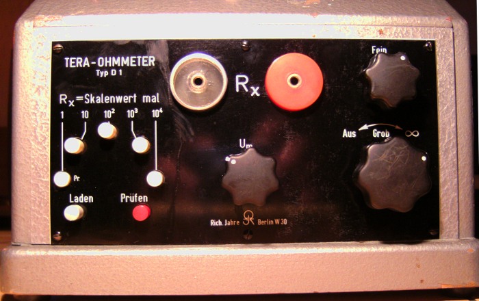 Im Moment mache ich noch einige Formierversuche. Das Verhalten der Elkos ist ganz unterschiedlich, eine Tendenz zumindest bei älteren aber ungebrauchten Elkos ist fast nicht auszumachen. Höchstens je älter, desto länger dauert das Formieren. So nach und nach komme ich darauf wie die richtige Bedienung des Messgerätes durchzuführen ist. Ein - Ausschalten und die Einstellung auf unendlich unten rechts, ein Nullohmabgleich wie beim einfachen Ohmmeter gibt es nicht. Oben rechts eine Feineinstellung. Eine Prüfung, Kalibrierung ist folgender maßen möglich: Den Bereichsschalter auf 1 X und die Taste prüfen drücken. Dem Messeingang wird ein genauer 1 M R parallelgelegt. Mit dem Regler U m (Messpannung) wird auf genau 1 M in der Skalenmitte eingestellt. Die Taste Laden ist für das Laden von Kondensatoren vorgesehen, aber für Elkos nicht besonders geeignet. Eine genaue Kalibration würde die genaue Einstellung auf 100 V erfordern. Der R i eines DMM verfälscht die Messung jedoch, hier müsste ein extrem hochohmiges Voltmeter zum Einsatz kommen. Also ein Spezialmessgerät für ein Spezialmessgerät.