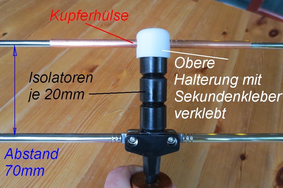 Das Problem ist die Größe eines Lambda 1/2 Dipols. Diesen auf dem Regal unterzubringen, ist fast unmöglich. Deswegen erdachte ich mir die Teleskoplösung. Beide Schenkel sind alte Teleskopantennen aus dem Bastelfundus. Den schönen Holzfuß drechselte mir mein Radiofreund aus einem Stück Apfelbaum. Die Konstruktion lässt sich bis auf 1660mm ausziehen und kann auf 550mm zusammengeschoben werden. Zwei Teleskope sind mit einer selbstgewickelten Kupferhülse verbunden und bilden den oberen Teil des Dipols. Um beide Teile zuverlässig zu verbinden, werden an den Enden verquetschte Krokoklemmen aufgesetzt. Dies ist natürlich ein Kompromiss, welcher der Flexibilität geschuldet ist. Anschlusskabel 300 Ohm Flachbandleitung mit Kabelschuhen.
