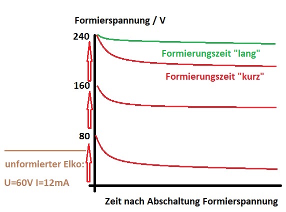 Rätselhaft war zunächst das immer gleiche Phänomen: Auch wenn der Elko einige Minuten an der Formierungsspannung hing, ging nach Abschaltung die Spannung am Elko recht schnell auf eine Spannung 20-30V darunter zurück und blieb dann recht stabil.