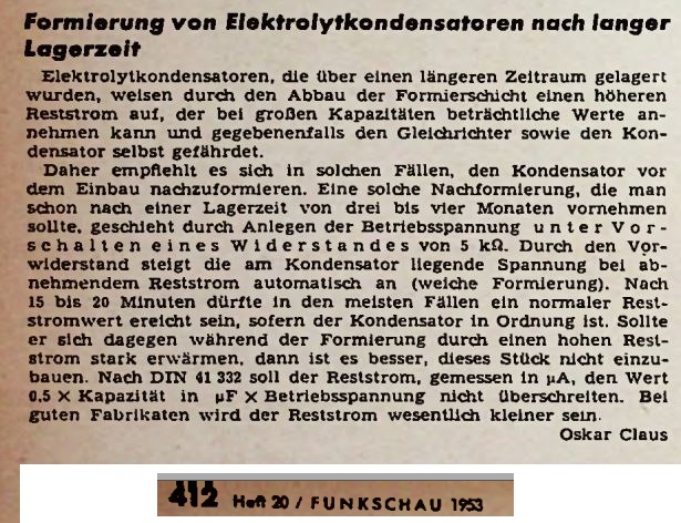 Fazit: Analog zur Funkschau 1953/Heft 20 (Korrektur) die Formierung zyklisch zwar mit hoher Spannung, aber mit Vorwiderstand (5 kOhm oder sogar am Anfang mit 33k) vornehmen. ("Stundenlanges" Formieren mit kleiner Spannung scheint zweckfrei zu sein.)