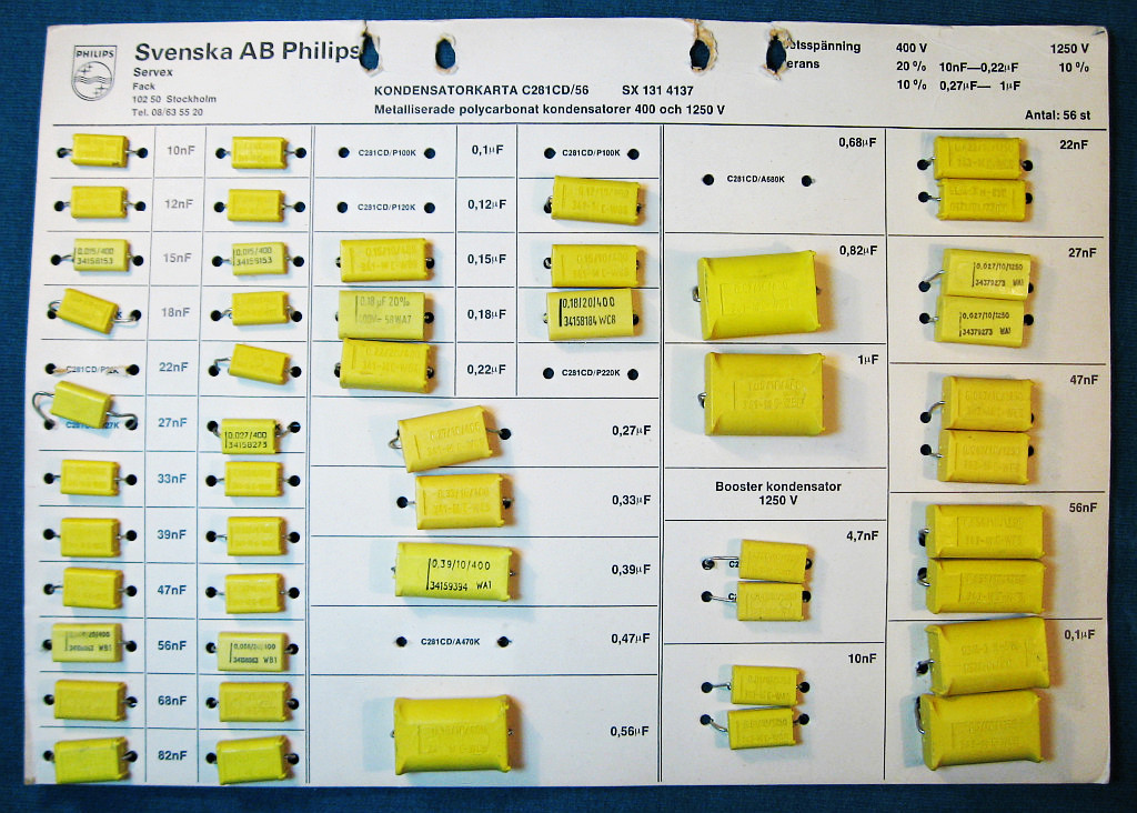 hier ein Karte mit Kondensatoren im DIN-A4-Format für den Service. Es handelt sich um eine Zusammenstellung von Polycarbonat-Kondensatoren für die Reparatur von Radios und Fernsehern: