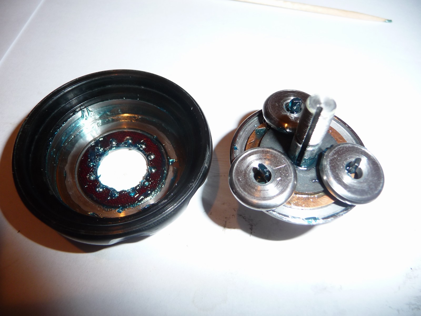 Beim reinigen der Kugellager ist es ratsam, die schärfste Brille aufzusetzen, die Kugeln sind nur gefühlte 0,5 mm stark und sie liegen nur lose in ihrem "Käfig". Einsetzten kann man sie nur mit einem leicht in Fett getupften Zahnstocher, mit den Fingern geht da garnix...