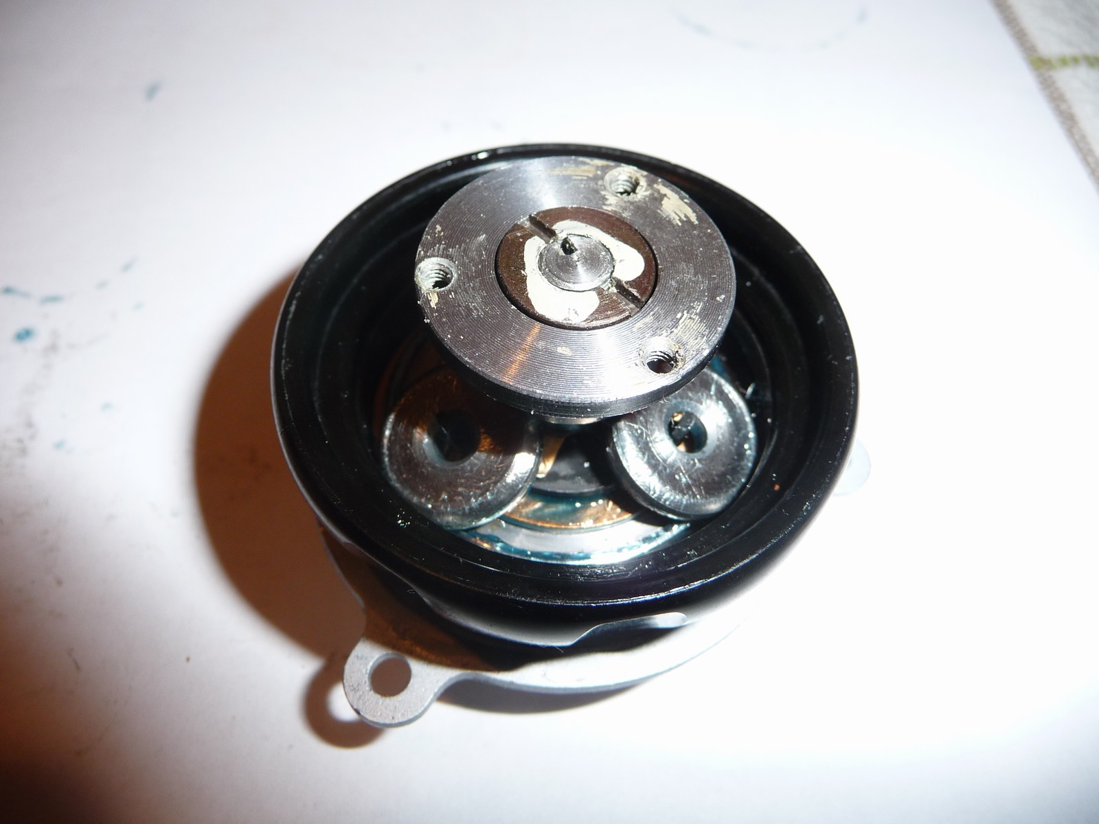 Wie man sieht, arbeiten im Feintrieb keine Zahnräder, sondern Reibrollen. Ich bin mir nicht 100%ig sicher, aber ich meine die 40:1 Übersetzung wird durch zwei "Stufen" erreicht, einmal wird der "Stern" der die Reibrollen trägt etwa 4:1 übersetzt, dann treiben die Reibrollen an irgendeiner Stelle ihres Umfanges eine Art Zwischenscheibe an, die dann eine nochmalige Übersetzung ergibt. Ist schlecht zu erkennen, da sich das unter den Rollen abspielt. Mit der geschlitzen Mutter ganz oben kann man den Anpressdruck der Rollen und somit die Leichtgängikeit der 40:1 Stufe einstellen, aber wenn man es zu leicht einstellt, rutscht der Antrieb durch.