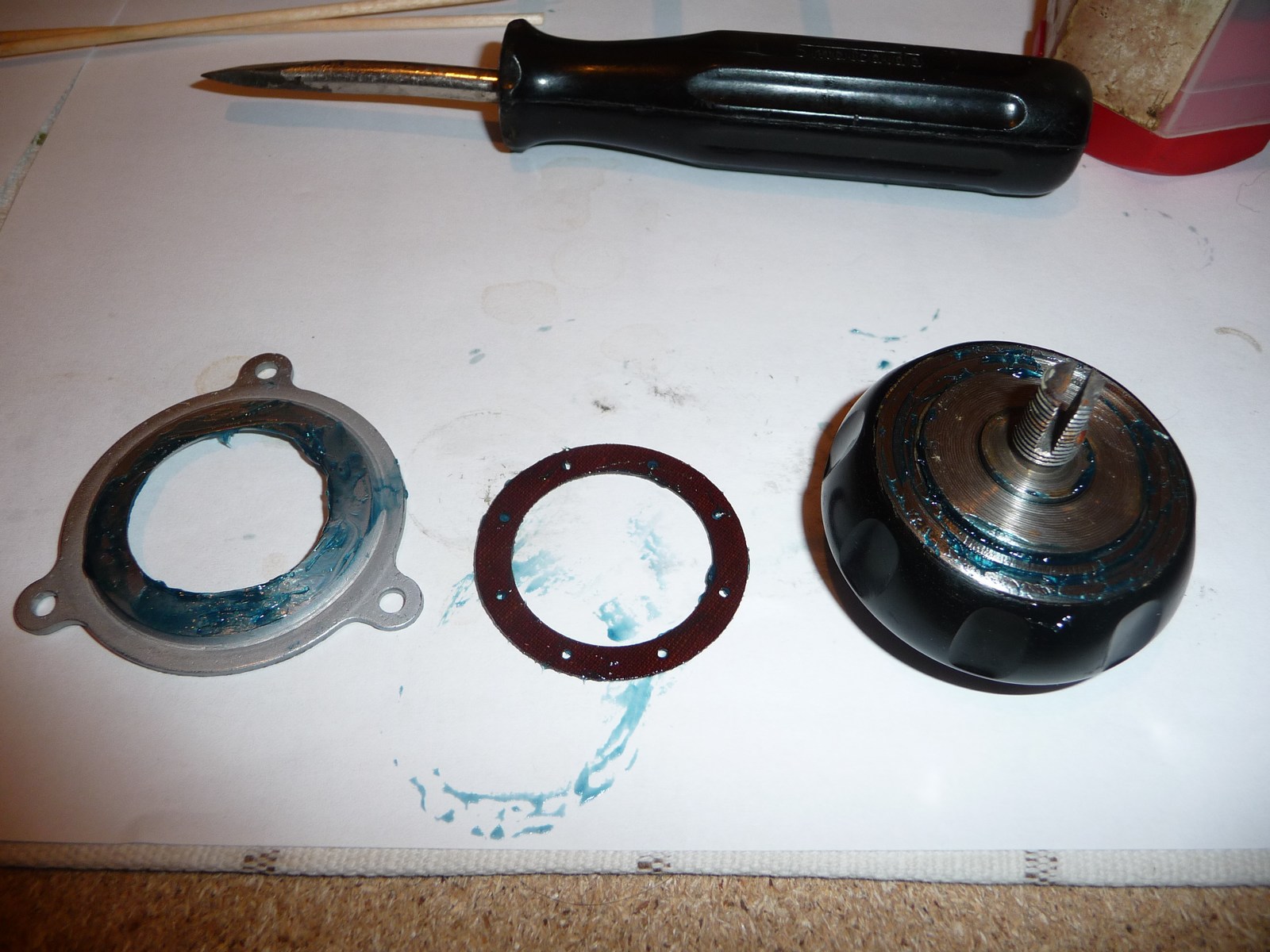 Meine Vermutung hatte sich bestätigt, das Fett hauptsächlich in den Kugellagern war recht hart, bzw. nicht mehr vorhanden. Also alle Teile mit Bremsenreiniger und Pinsel gereinigt und die wichtigen Stellen mit säurefreiem Fett neu geschmiert und zusammengebaut. Zuerst die 40:1 Seite: