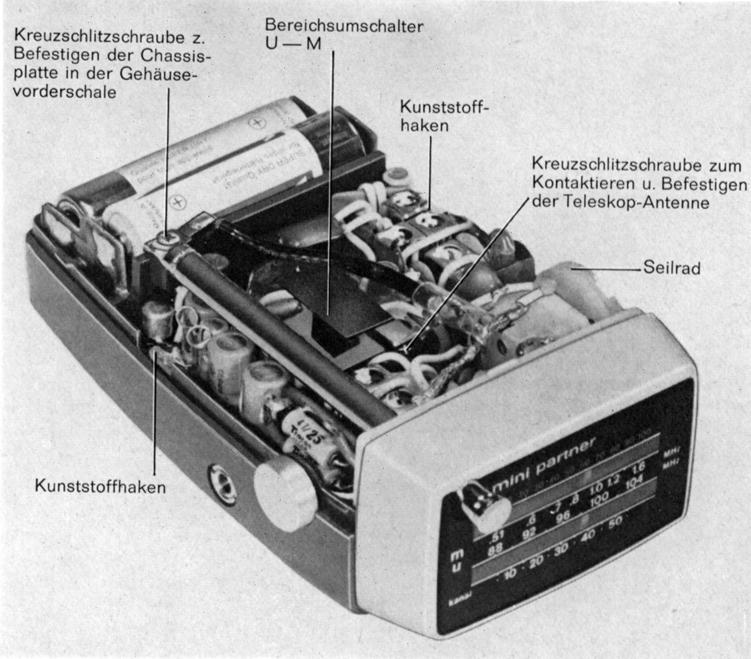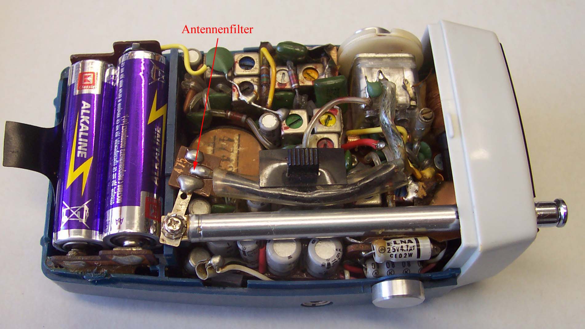 Das S/W-Bild stammt vom Hersteller " TELEFUNKEN - sprecher Heft 53/1970" und sollte keine Urheberechtsprobleme verursachen. Auf meinem Bild sieht man die kleine Platine an der Teleskopantenne mit der Spule und den zwei Kondensatoren.
