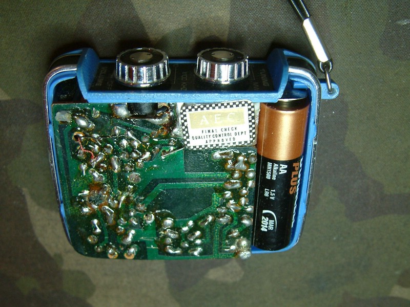 Das Gerät hat eine HF Vorstufe, einen Oszillator, einen ZF und 2 Endstufentransistoren, somit 5 Stück. Die Kleineisenendstufe ist derart empfindlich daß der Umkehrtrafo direkt aus dem Demodulator gefüttert wird. Der Lautsprecher hat 0,1 Watt. Faszinierende 1,5-Volt-Technik, alles Germanium.
