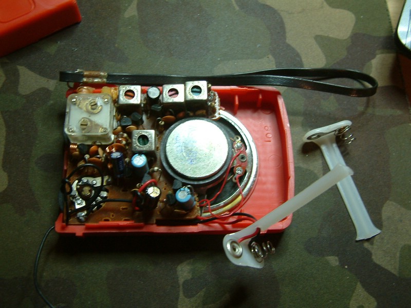 der Empfänger hat HF seitig 4 Stück 2SC1417, am letzten Filter 2 Ge Dioden, dann PC9014 (?), BC558, PC9012, PC9013 und eine weitere Diode, die zusammen mit den beiden letzten eine kleine PP Endstufe ohne Trafo bildet. Also 8 Stück, + 3 Dioden. Der Lautsprecher hat 1/2 Watt.