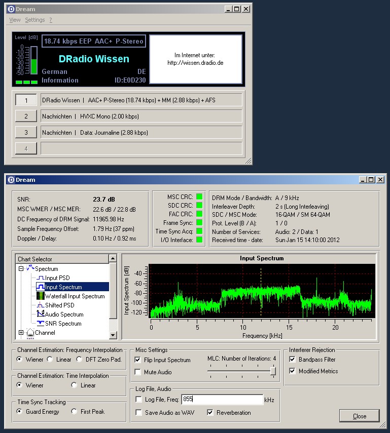 Der DRM-Sender DRadio Wissen auf 855 kHz kommt mit 25 dB S/N, 20 kW, aus Berlin hervorragend an.