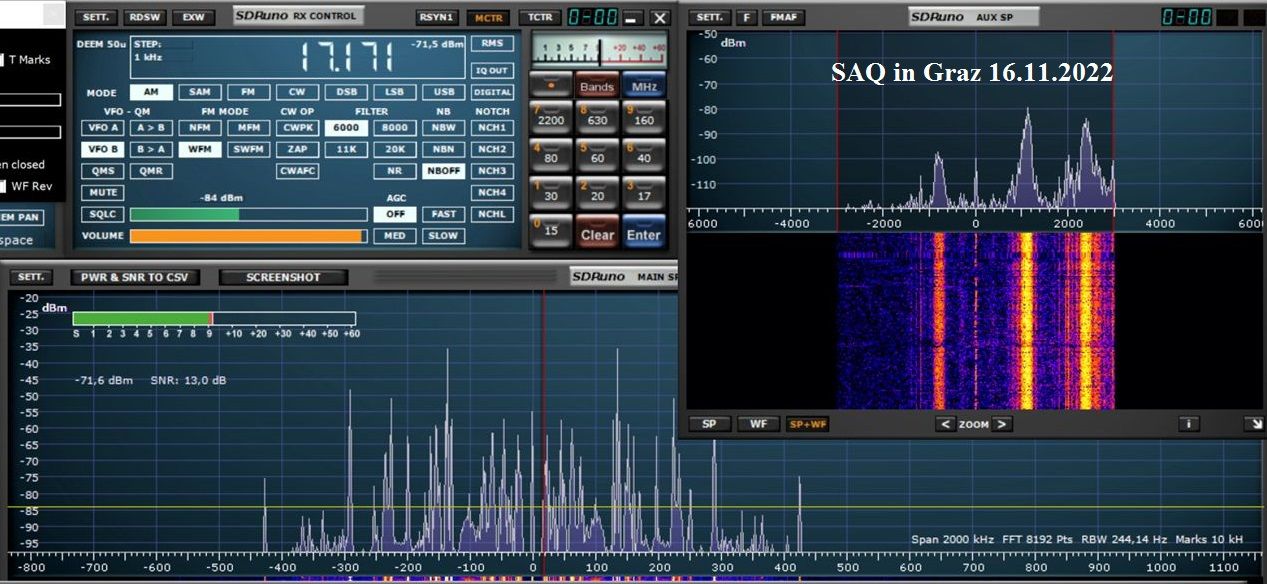 bei mir in JN47JJ war das Signal so etwa 5dB über dem QRM vom Quartier und damit nur zeitweise lesbar. Ausserhalb der Zivilisation hätte es wohl funktioniert. Als Antenne diente die 2.5m-Loop im Kurzschluss, also aperiodisch. Das Signal direkt anschliessend auf ca. 18kHz war etwa 40dB über dem Pegel von SAQ. Ich hatte SAQ hier auch schon wesentlich besser empfangen.