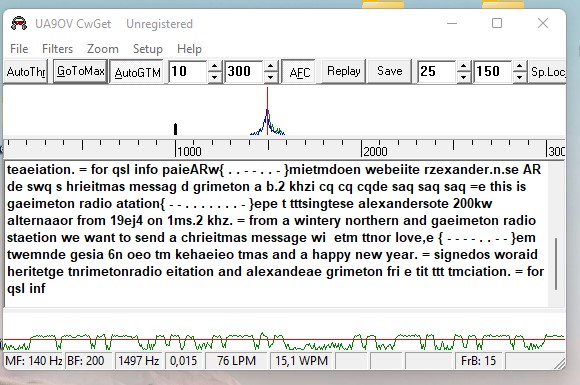 bei mir in der Schweiz war der Empfang sehr gut mit der aperiodischen 2.5m-Loop auf dem Sitzplatz und dem Eigenbau-SDR, der Störabstand mit dem 100Hz-Filter war fast 20dB. Die Frequenz von SAQ schwankte immer noch, aber blieb innerhalb der Filterbandbreite, so dass der Empfang bequem möglich war. Das Wetter hier ist strahlender Sonnenschein, warm und windig.