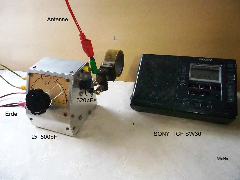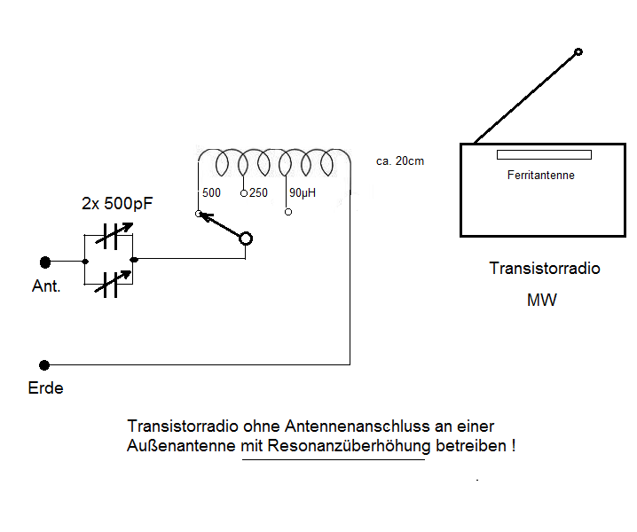 Noch einfacher geht's mit einer (Steck-) Spule, etwa 50mm Durchmesser (50 Windungen, ca. 80-100 µH) und einem zusätzlichen Drehko 2x 500pF. Die externe Drahtantenne wird über den Drehko (beide Pakete parallel) in Serie mit der Einkoppelspule verbunden. Das andere Ende der Spule muss geerdet sein. Die Ankopplung ist nur lose, seitlich vom Radio..... Nun kann man mit dem Drehko auf Serienresonanz abstimmen und den gewünschten Sender viel, viel besser empfangen.