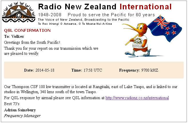 Die QSL gab es online, nachdem ich ein paar Tage zuvor meinen Hörerbericht auf der Webseite von Radio Neuseeland eingetragen hatte. Wie schön, dass es noch Länder gibt, die Kurwellenrundfunk betreiben und fördern. Wie es die Neuseeländer vormachen, kommt man mit 100 kW doch ganz schön weit.