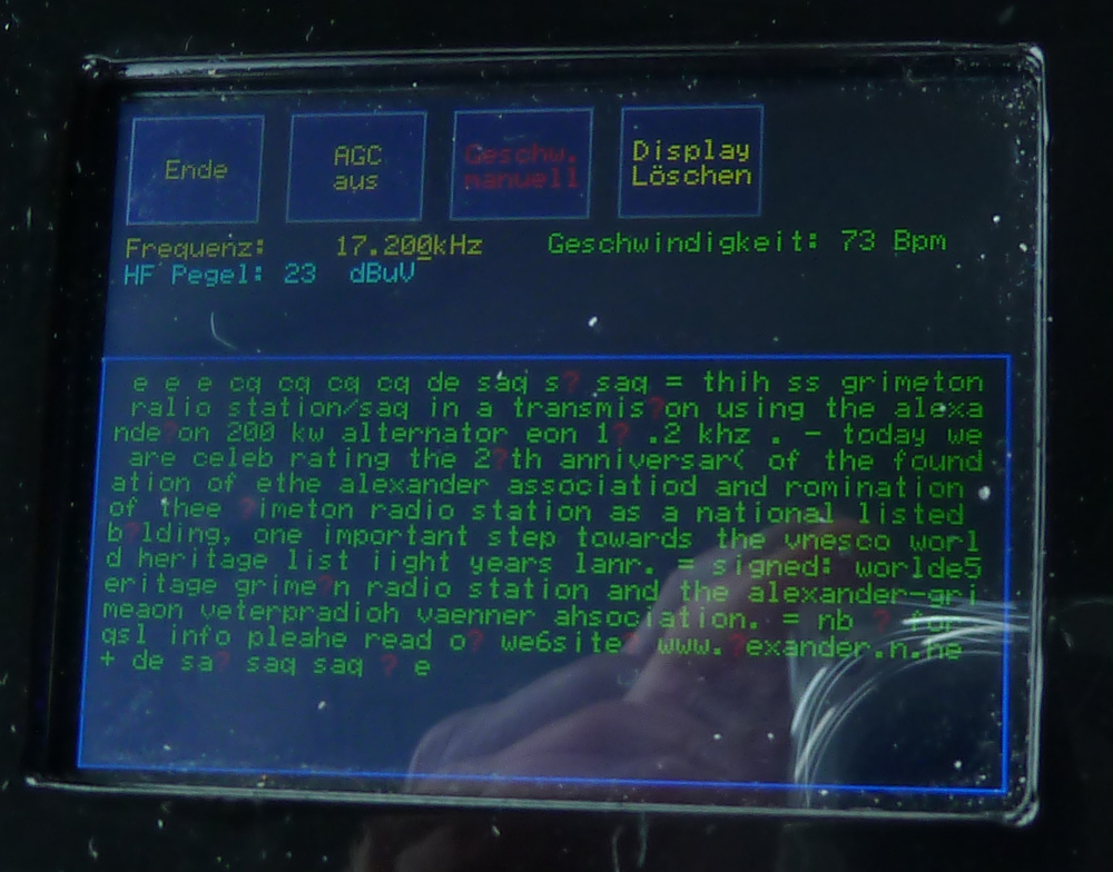 Hier noch der Mitschnitt vom CW-Dekoder. Die Krach-Störungen gaben ein paar Dekodierfehler, und mindestens 2 Zeichen wurden auch falsch gesendet, aber insgesamt gut lesbar: