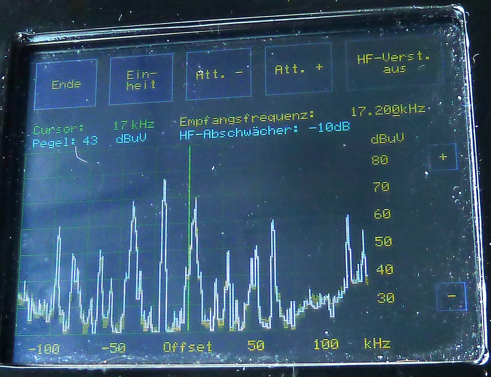 Hier das HF-Spektrum, bei der grünen Linie ist 17.2kHz, es ist einiges los. SAQ ist etwa 30dB schwächer als der Peak bei 22kHz, aber +/-500Hz um 17.2kHz ist ruhig (im Spektrum nicht zu sehen, weil die Frequenzauflösung zu gering ist).