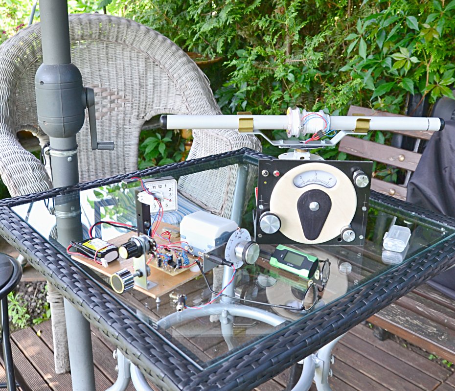 Hier im Garten QTH war SAQ heute Vormittag ebenfalls problemlos aufzunehmen, die Ferritantenne hat sich bestens bewährt. Da ich nicht sicher war, ob die Empfindlichkeit des 0V2 ausreicht, kam noch ein Transistor Reflexempfänger zum Einsatz. Mit beiden Empfängern war das Signal klar und deutlich lesbar, mit leichtem Vorteil für das Transistoraudion. Anbei ein Foto vom "Tatort" und ein kurzer Mitschnitt. Zwischen Sekunde 8 und 18 kann man meinen Hauptgegener, die russische Marine hören.