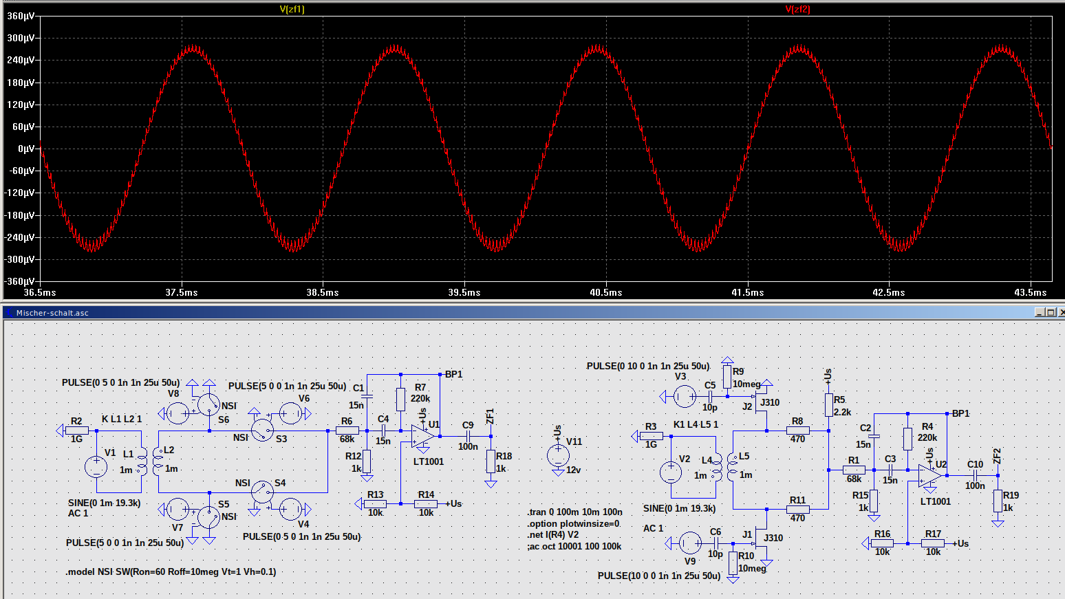 Habe je ein 2pol. Filter angehängt, um die Kurven übereinander zu haben. Trotzdem das Signal im linken Mischer über die Schalter mit jeweils 60 Ohm Widerstand läuft, ist die Dämpfung in beiden Mischern identisch. Bei den kleinen Strömen spielt es offenbar so gut wie keine Rolle, wenn ich das richtig sehe. Im praktischen Aufbau arbeiten beide Mischer einwandfrei, nur die Verstärkung der Gilbertzelle fehlt, man muß reichlich nachverstärken.