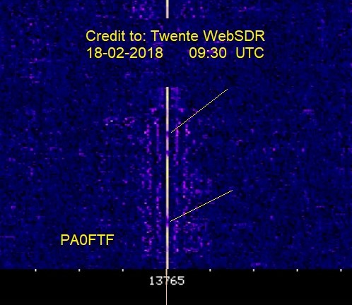 Oftmals fällt sogar nur der Träger weg = selektives Fading. Ein Empfänger mit Synchron-Detektor kann das meistens gut auffangen. Hier ein Beispiel aufgenommen im 22m Band. Man beachte den Wegfall des Trägers, die Seitenbänder sind aber noch da!
