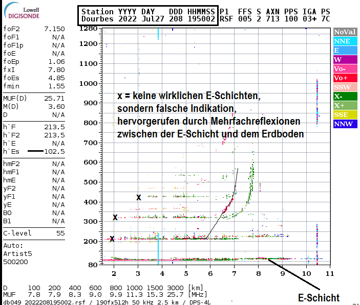 Die E-Schicht Reflexion fand in 102,5 km Höhe statt. Abnormal stark war jedoch die Reflexion bei der Messung mit Steileinstrahlung. So stark, dass das Retoursignal von der Erde wieder nach oben reflektiert wurde und dann erneut zum Empfänger gelangt. Der Computer sieht das als doppelte Laufzeit und denkt, dass da noch eine zweite Schicht besteht (in doppelter Höhe), was aber nicht der Fall ist.