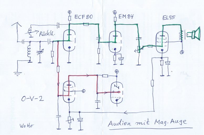 Hier das vereinfachte Schaltbild: Oben links die normale Audionschaltung mit Rückkopplung. Am Gitter der Triode ECF80 ensteht die neg. Richtspannung. Über einen Hochohmwiderstand wird diese abgezweigt (in rot) und zur Pentode der ECF80 geführt. An derer Anode erhalten wir die verstärkten Gleichspannungsschwankungen, welche zum Steuersteg der EM84 gehen. Kondensatoren sorgen für eine Beruhigung der feldstärkeabhängigen Anzeigespannung. Gut hörbare Radiostationen lassen die Fächer deutlich auf einander zubewegen!