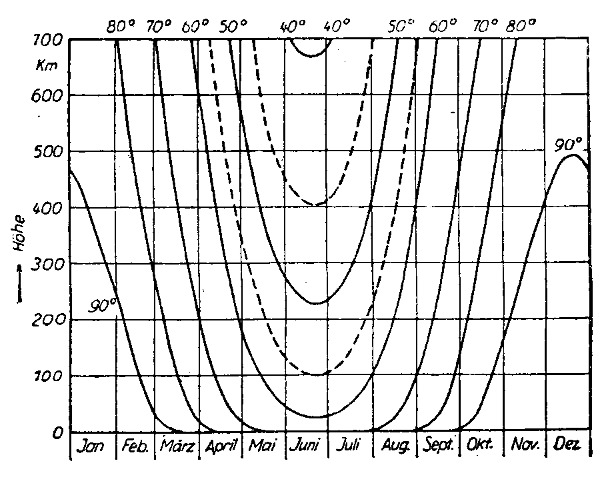 Wie so oft ein bisschen "Grafiksenf" von mir. Diese zeigt die Höhe der Grenze des Sonnenschattens um Mitternacht in den geographischen Breiten 40° bis 90° im Laufe des Jahres. Sogar in Norddeutschland im Sommer ist in 100 km Höhe die Sonne den ganzen Tag zu sehen.