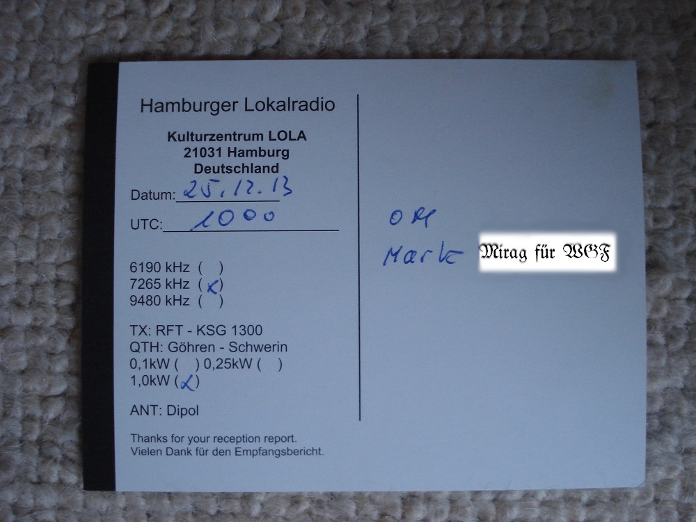 Jetzt würde es gesagt. Das Hamburger Lokalradio veranstaltete eine. Testsendung auf 7265 kHz, gesendet aus Meck-Pomm mit 1kW. Für einen Empfangsbericht gibt es eine Sonder QSL. Rückporto ist erbeten.