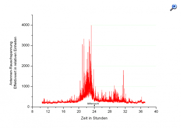 Am Vormittag des Pfingstmontags hatte ich diese Anlage mal wieder angeworfen und sich für 24h selbst überlassen. Die Ergebnisse zeigt die Graphik. Die Antennenspannungswerte sind hier noch nicht kalibriert. Als Anhaltspunkt kann man davon ausgehen, daß der Antennenpegel zu Beginn der Aufzeichnung bei wenigen 10µVeff liegt. Der starke Anstieg fällt zeitlich mit der Gewitterfront in NRW in dieser Nacht zusammen. Ich nehme deshalb an, daß er auch davon verursacht ist. Die Entfernung zwischen meinem Standort und NRW liegt bei ca. 600km.