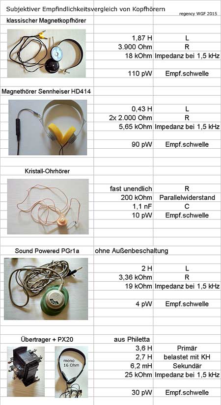 ich gehöre auch zur "HD414"-Generation (30 Jahre benutzt, 3 Exemplare) und kann über die 10pW nur schmunzeln. Den Hörer habe ich schon am Anfang meiner Detektorversuche zur Seite gelegt, er belegt in puncto Empfindlichkeit einen hinteren Platz.