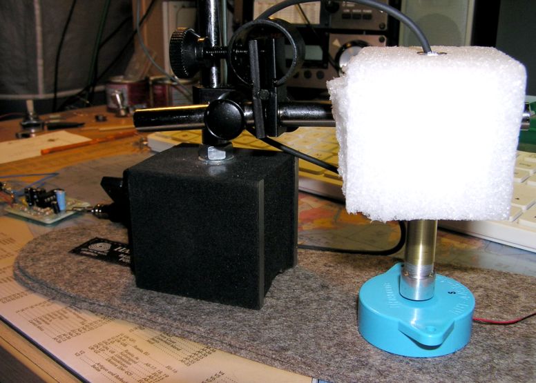 Das Mikro ist in einem Messingrohr elastisch eingesetzt und steckt senkrecht in dem Schaumstoff, der auf dem Arm des Meßstativs aufgesteckt ist. Als Testobjekt dient auf dem Foto gerade eine Kyocera Kapsel. Im Hintergrund ist der kleine Vorverstärker zu erkennen.