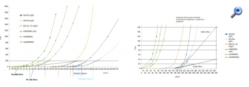 Bei den modernen Darstellungen scheint es da ein Problem zu geben: Die haben alle keinen "Knick" , alle Kennlinien erscheinen irgendwie merkwürdig nach rechts gekrümmt. Kommt von der "logarithmische" Darstellung, die Auflösung im "unteren" Bereich ist höher und der Knick erscheint als ziemlich gerade Linie. Um ihn also darzustellen, muß umgezeichnet werden: (Mit "Paint" wurden die originalen Kennlinien an die Gitternetzlinien angepasst, um die Werte genauer ablesen zu können. Dabei erscheinen die Linien wesentlich verwaschener als im Original.) [Edit] Mit der SD101C konnten die besten Ergebnisse erzielt werden, das Datenblatt zeigt einen recht scharfen "Knick".