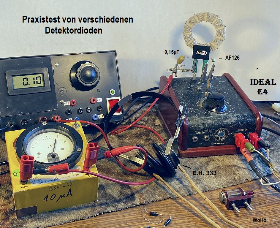 Es wird eine modulierte HF-Spannung von etwa 20 mV in Serie (Kurz-Schaltung) eingekoppelt. Das ist rel. wenig, nicht genug um eine ausreichende Lautstärke im Kopfhörer zu liefern. Es geht jedoch im Moment darum, mit welcher Diode lässt sich die größte Empfindlichkeit erzielen.
