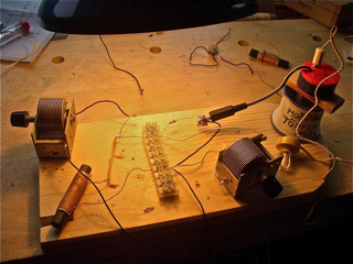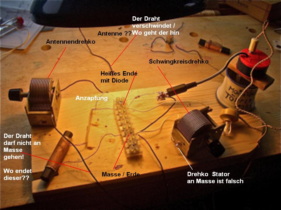 Im Hintergrund sieht man noch zwei Spulen, mit denen ich herum probiert habe: links offenbar KW, viele Sender, alledings "mit Lampe"; Abstimmung über Spule. / Rechts eine dem Versuchsaufbau ähnliche Spule, vmtl. MW.