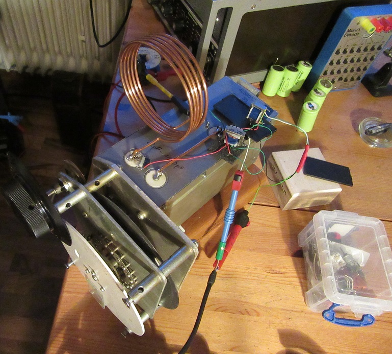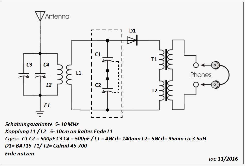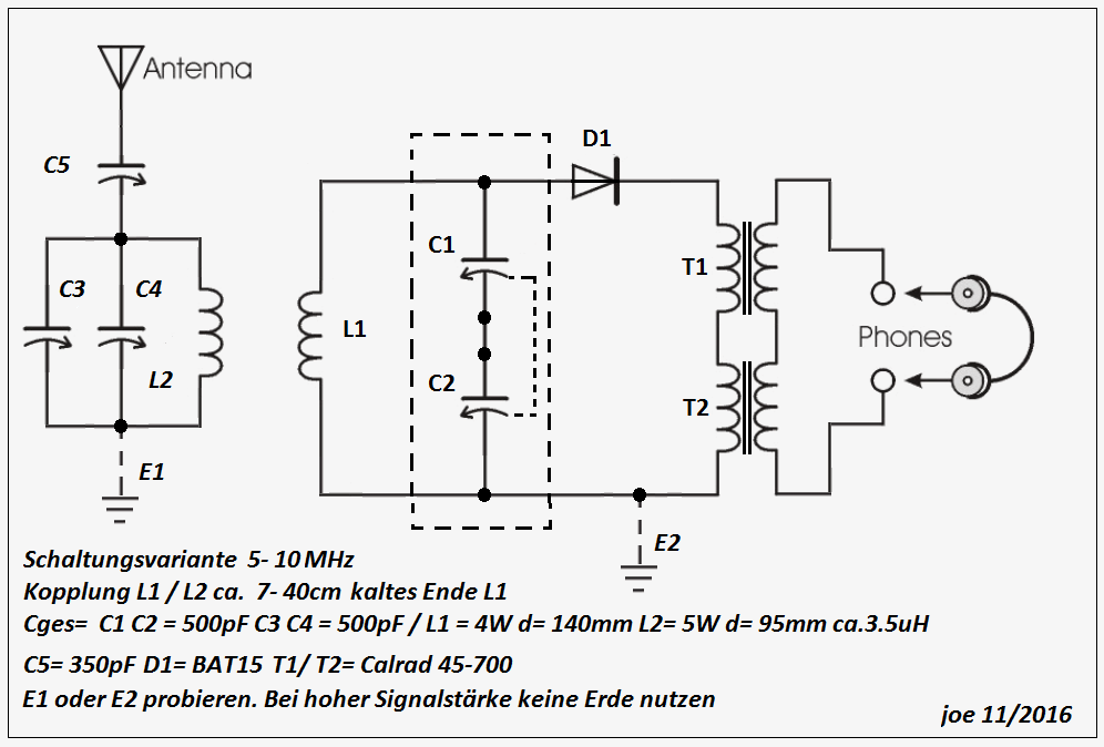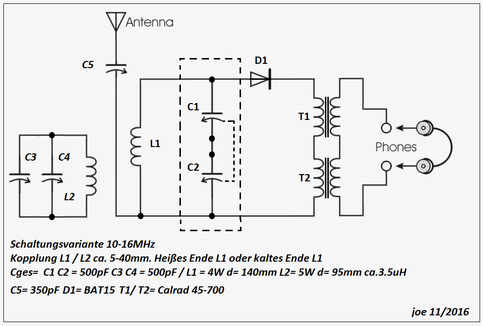 Die Lautstärke mit dem SP- Hörer ist manchmal echt krass und ist wahrscheinlich die Ursache dafür, dass ich die Kopplungsentfernung so weit auseinanderfahren kann. Bei hoher Signalstärke schalte ich dann einen 25pF- Trimmer zur Antennenanpassung zu und klemme C5 ab. Jeder hat mit seinem Aufbau immer etwas andere Ergebnisse. Dies hängt hauptsächlich mit der jeweiligen Antennen- und Erdsituation zusammen.